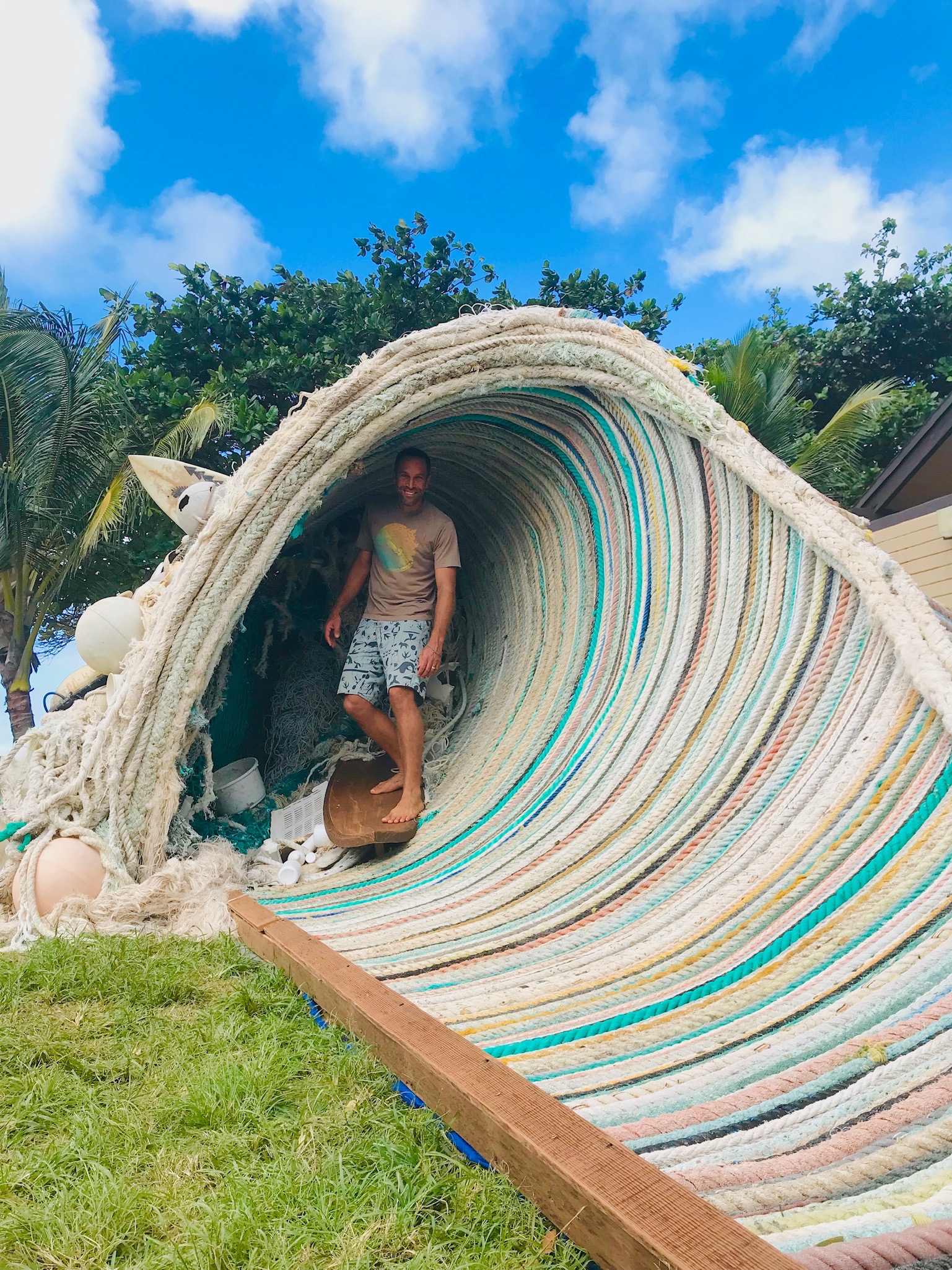 As part of the Plastic Free Pipeline Project in 2018, Ethan teamed up with Jack, Sustainable Coastlines Hawaii, Kokua Hawaii Foundation, and WSL Pure to create a large sculpture of Banzai Pipeline from plastic pollution, fishing nets and reclaimed lumber. The sculpture was on display at the Pipe Masters event and engaged thousands of local students, surfers, and community members. This new sculpture made out of golf balls will help to build the wave of momentum to inspire action through art.