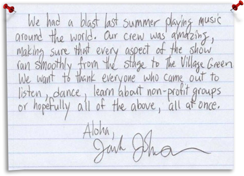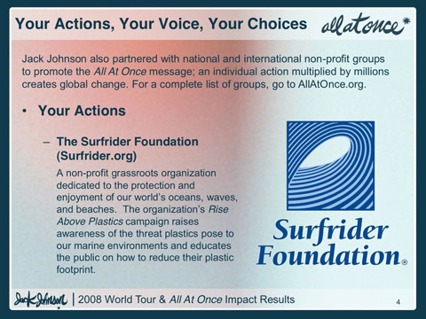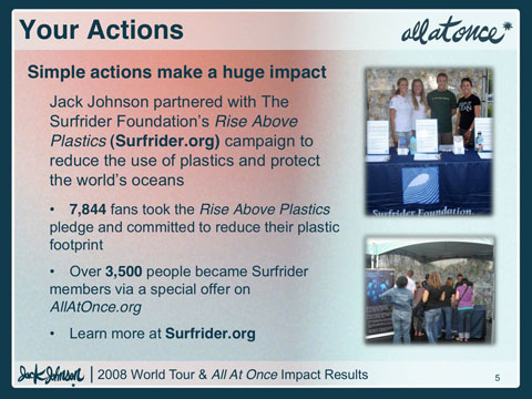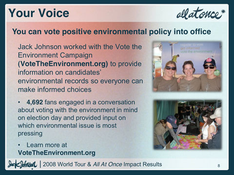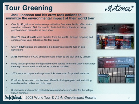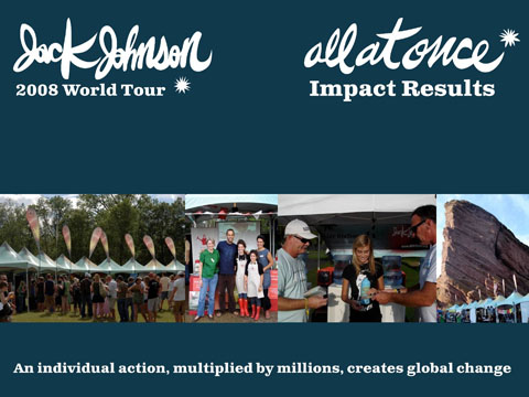 Efforts were taken to reduce the environmental impact of Jack Johnson’s 2008 World Tour including powering buses, coaches and generators with over 14,000 gallons of sustainable biodiesel (bio fuels burn cleaner than petroleum and generate dramatically less carbon emissions), recycling and composting over 70 tons of waste from Jack’s US tour dates, and more.