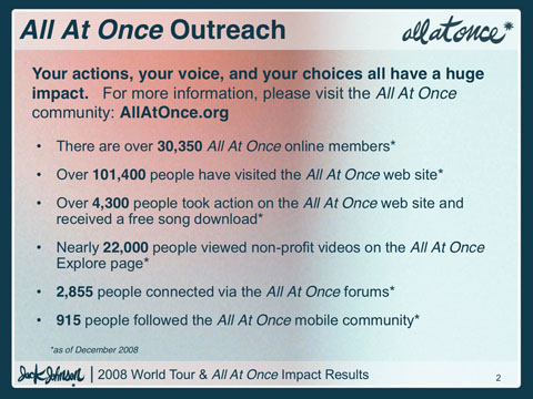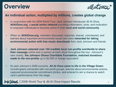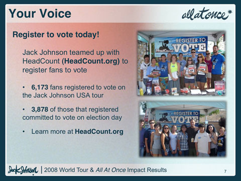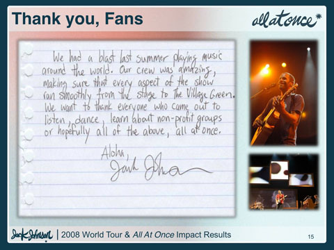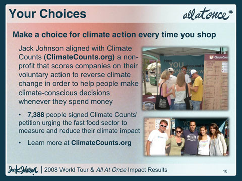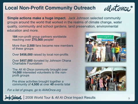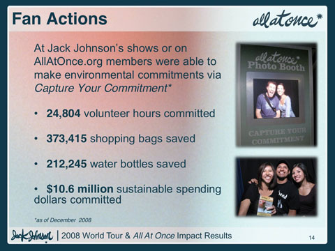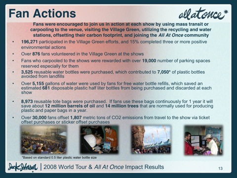 Additionally, Jack Johnson offered fans the opportunity to offset fan automobile travel when they purchased a concert ticket through Ticketmaster. Over 31,500 fans offset a combined 1,807 metric tons of carbon from their travel to a show. As a result, 4,172 metric tons of CO2 were offset from the tour.
