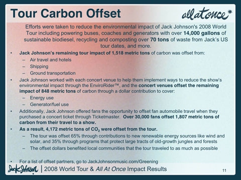 Jack Johnson worked with each concert venue to help them implement ways to reduce the show’s environmental impact through the EnviroRiderTM, and the concert venues offset the remaining impact of 848 metric tons of carbon through a dollar contribution to cover: