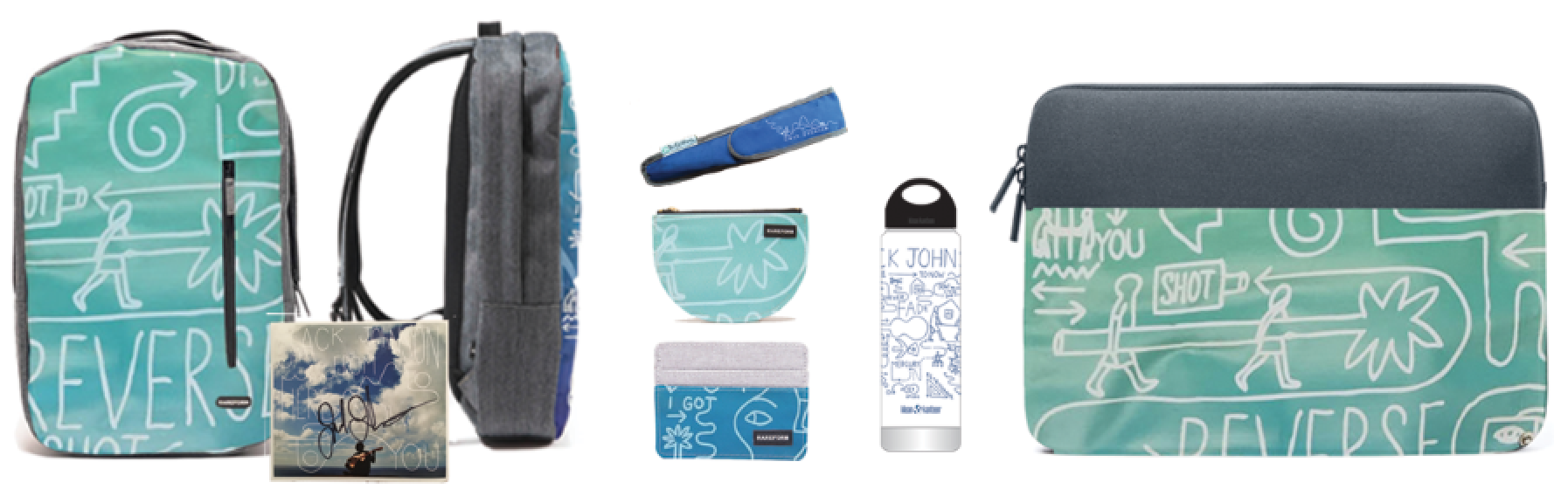 Rareform intercepts billboards, and in our case old banners, before they reach the landfills. They used this so called “trash” to create unique 15” computer sleeves, accessories and limited edition upcycled backpacks, each backpack comes with an autographed Jack CD. Next up is a limited edition From Here to Now to You Klean Kanteen Vacuum Insulated 20oz mug. There are only 100 of these so get yours before they are gone. Last up are Reusable To-go ware bamboo utensil sets complete with a bamboo fork, knife, spoon and chopsticks in a durable and eco friendly RPET utensil holder. In an attempt to create less waste we hope you will enjoy these upcycled items as much as we do!