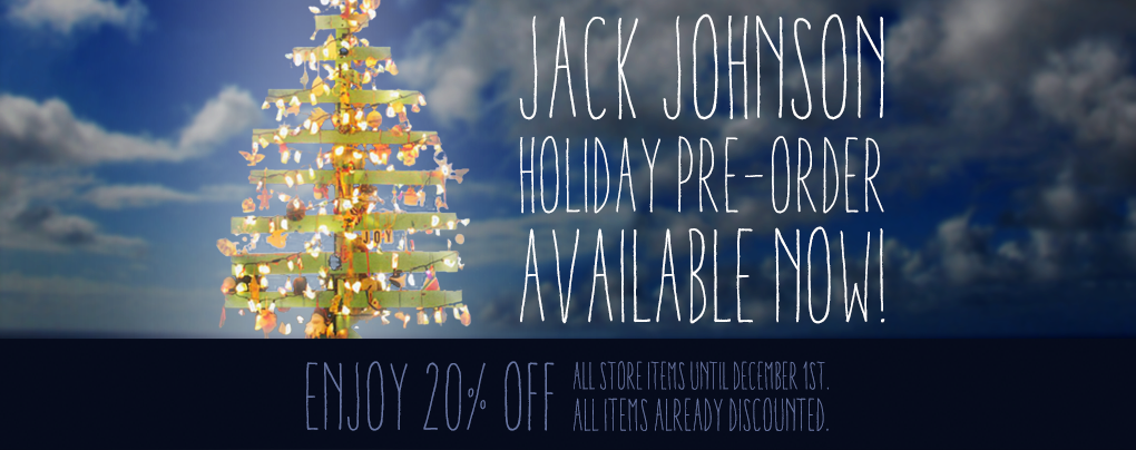 As part of the Holiday pre-sale, we are giving our loyal newsletter subscribers first notice to enjoy a 20% discount on the entire Jack Johnson online store through Tuesday, December 1st, 2015. Early birds do get the worm! Visit