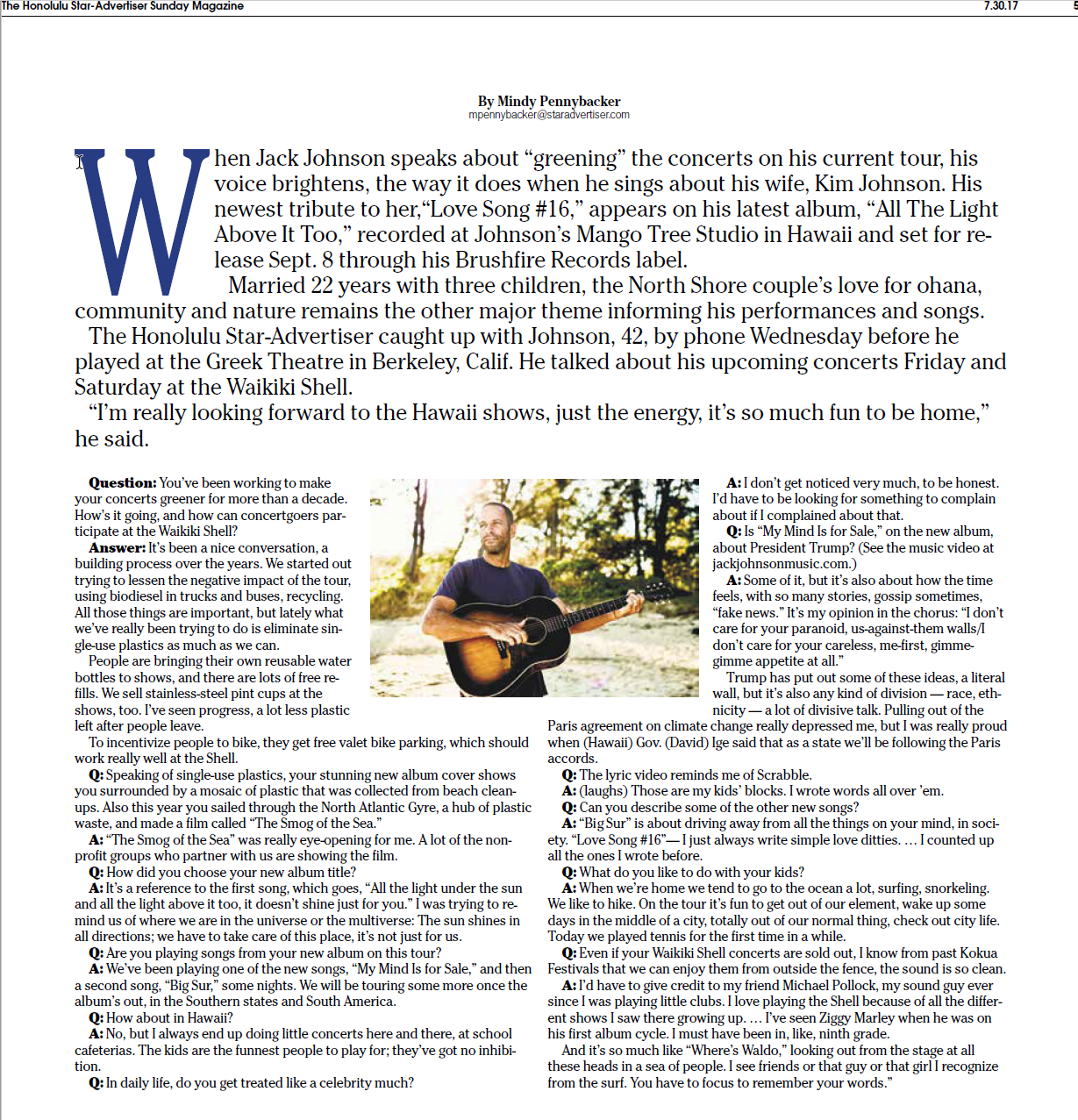 Jack Johnson Interview in Honolulu Star Advisor