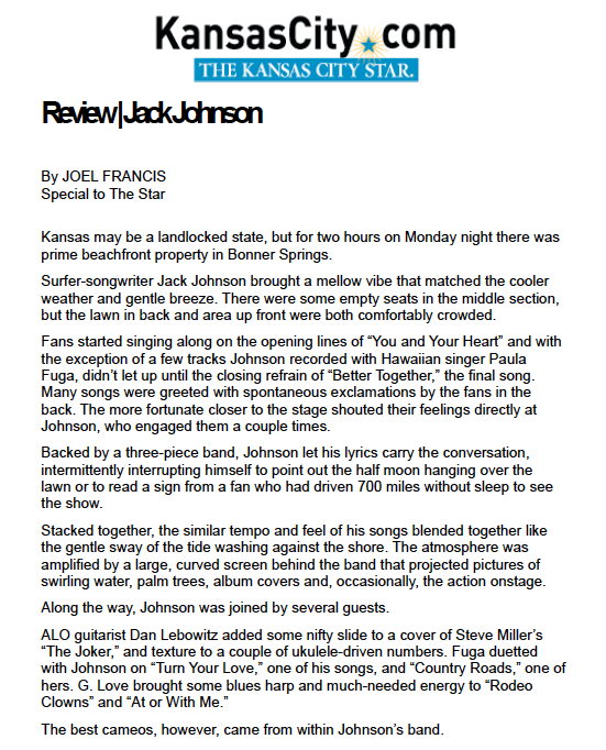 Kansas may be a landlocked state, but for two hours on Monday night there was prime beachfront property in Bonner Springs. Surfer-songwriter Jack Johnson brought a mellow vibe that matched the cooler weather and gentle breeze. There were some empty seats in the middle section, but the lawn in back and area up front were both comfortably crowded.